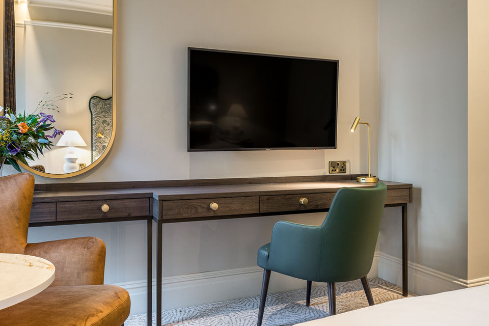 Designed and delivered by GDC, the guest rooms feature a vibrant palette of teal, gold, and mustard, balanced by dark timbers and marble accents for a warm, sophisticated feel. To maximise light and showcase courtyard views, curtains were placed between two arched windows. The ensuite, lined with natural Carrara marble, evokes calm and wellbeing, with brass details and artisanal touches subtly honouring India’s heritage. These thoughtful enhancements reinforce the Taj Group’s reputation for